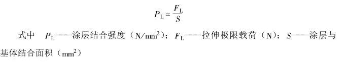 涂層拉伸強度是涂層承受法線方向(垂直于涂層表面)拉伸應力的極限能力,這是評定涂層結(jié)合力的最重要指標。試驗中,利用試驗工具或設備使試樣承受垂直于涂層表面的拉伸力,直至試樣被拉開,即涂層剝離,記下破壞時的載荷,以試樣的斷面積除此載荷值,即可計算出涂層的拉伸強度。如下式: